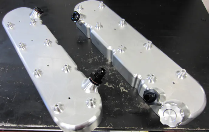 Then, flipping the hollowed-out billet over, all the external details, like the A/N fitting mounting bosses,oil fill neck, along with the integral coil pack stands. Add in the fact that a part such as this needs to be as aesthetically pleasing as it is functional, and you’re adding in challenging compound radii on all of the facets and you start to realize how challenging of a project this is for students. It’s also a lot of fun to watch happen.