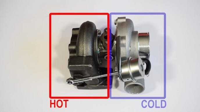 The most basic way to describe a turbocharger is that there’s a hot side and a cold side. The exhaust spins the turbine on the hot side, which transfers that energy through a common shaft to the compressor wheel (cold side). A mechanical actuator opens the wastegate on the hot side when the pressure overcomes the spring. Clear as mud?